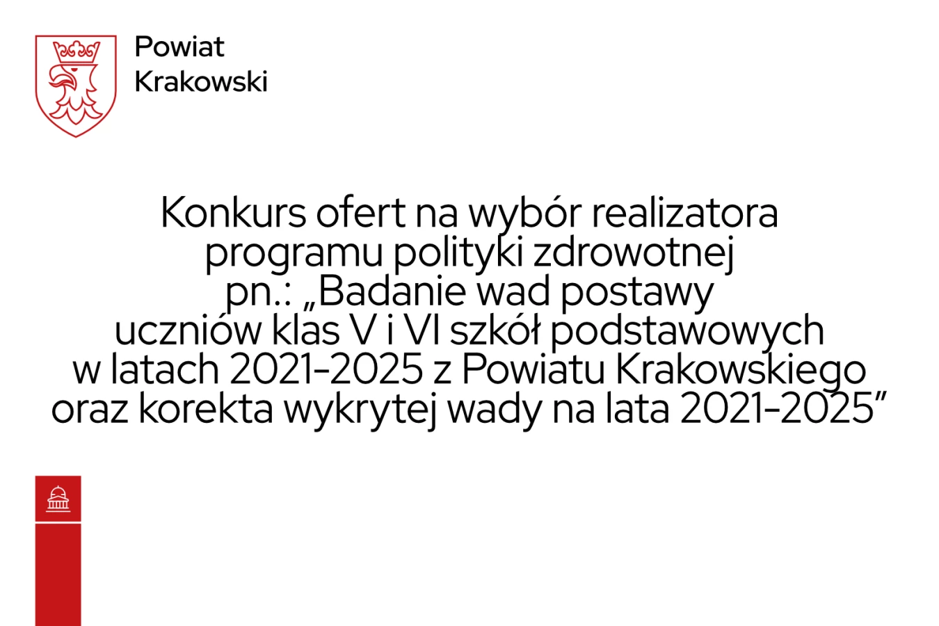 Zarząd Powiatu w Krakowie ogłasza konkurs ofert na wybór realizatora programu polityki zdrowotnej pn.: „Badanie wad postawy uczniów klas V i VI szkół podstawowych w latach 2021-2025 z Powiatu Krakowskiego oraz korekta wykrytej wady na lata 2021-2025”