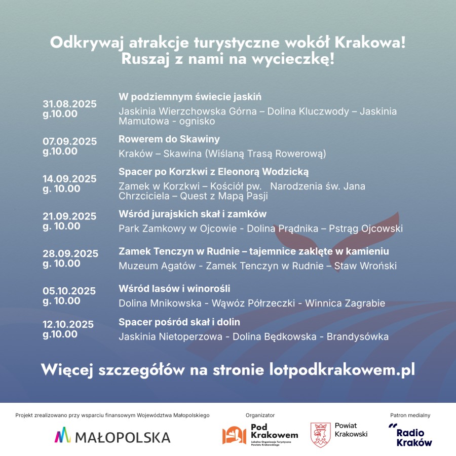 Lokalna Organizacja Turystyczna Powiatu Krakowskiego „Pod Krakowem” zaprasza mieszkańców i turystów do udziału w nowym projekcie promującym ekoturystykę i aktywne spędzanie wolnego czasu. Już od 31 sierpnia 2025 roku, w każdą niedzielę przez siedem kolejnych tygodni, rusza cykl bezpłatnych wycieczek z przewodnikiem po najpiękniejszych zakątkach powiatu krakowskiego.