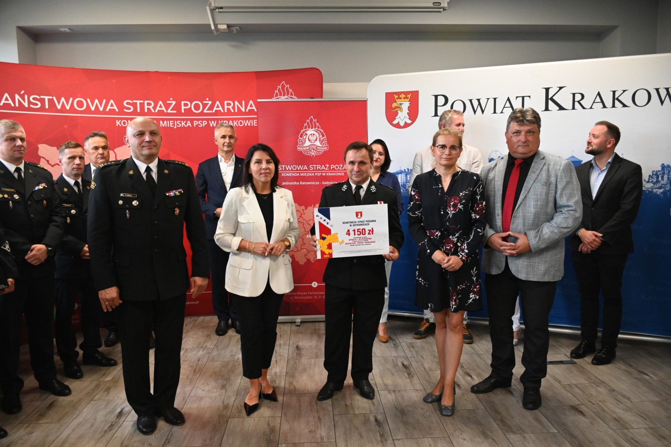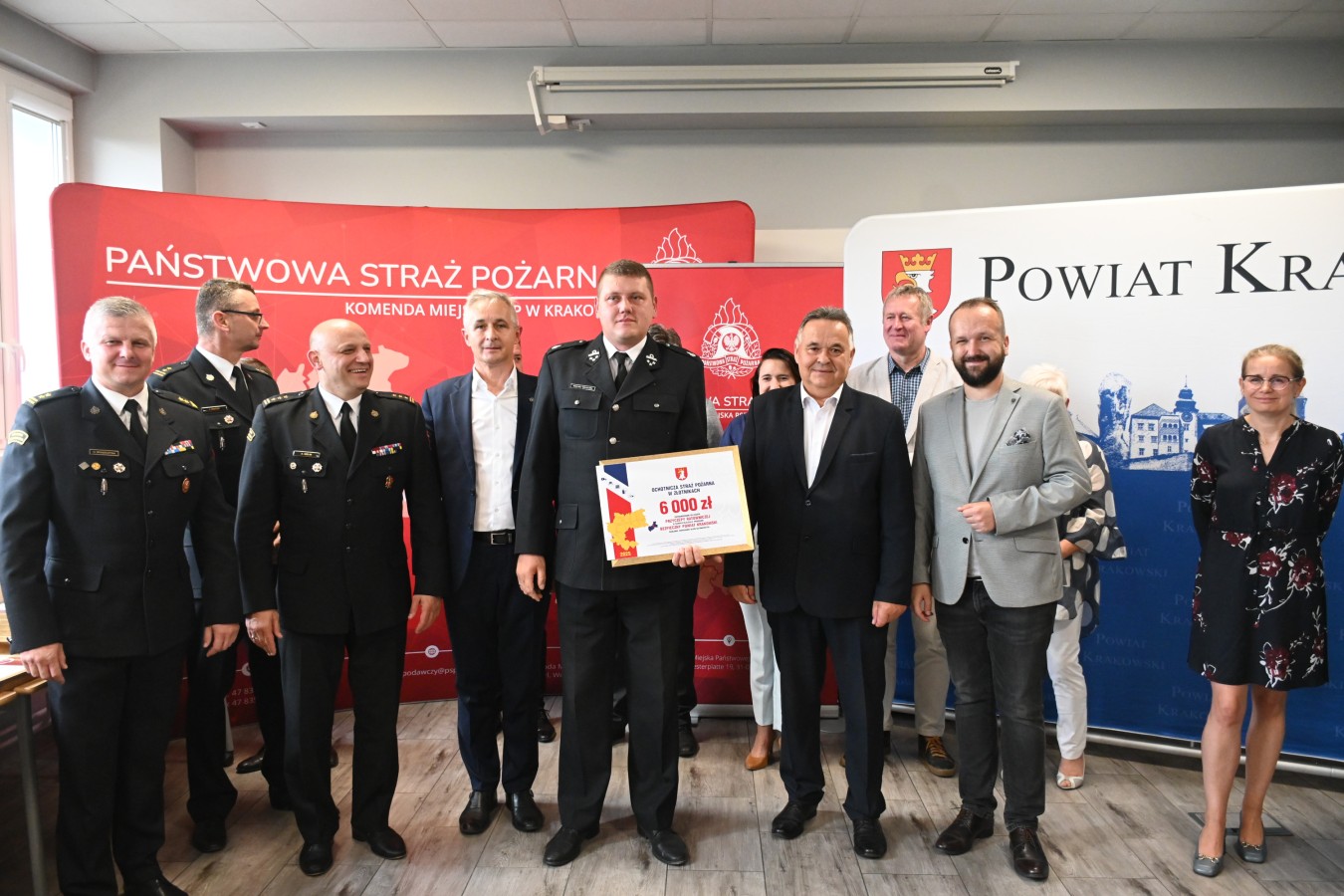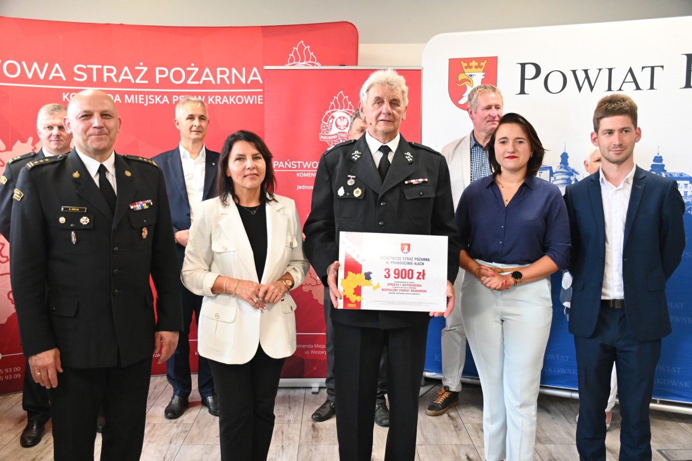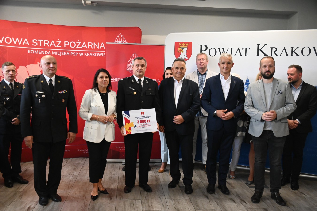 15 lipca 2025 r. na terenie Jednostki Ratowniczo-Gaśniczej Nr 5 w Krakowie odbyło się uroczyste wręczenie promes z dofinansowaniem do zakupu sprzętu i wyposażenia lub do zakupu samochodów i innych środków transportu w ramach działania „Wspieranie służb mundurowych” z programu „Bezpieczny Powiat Krakowski”