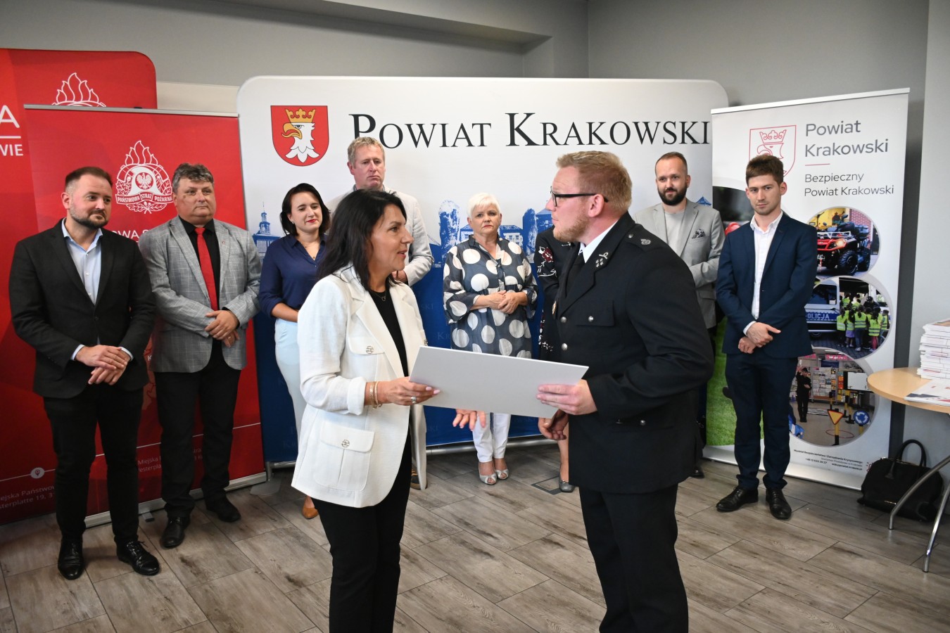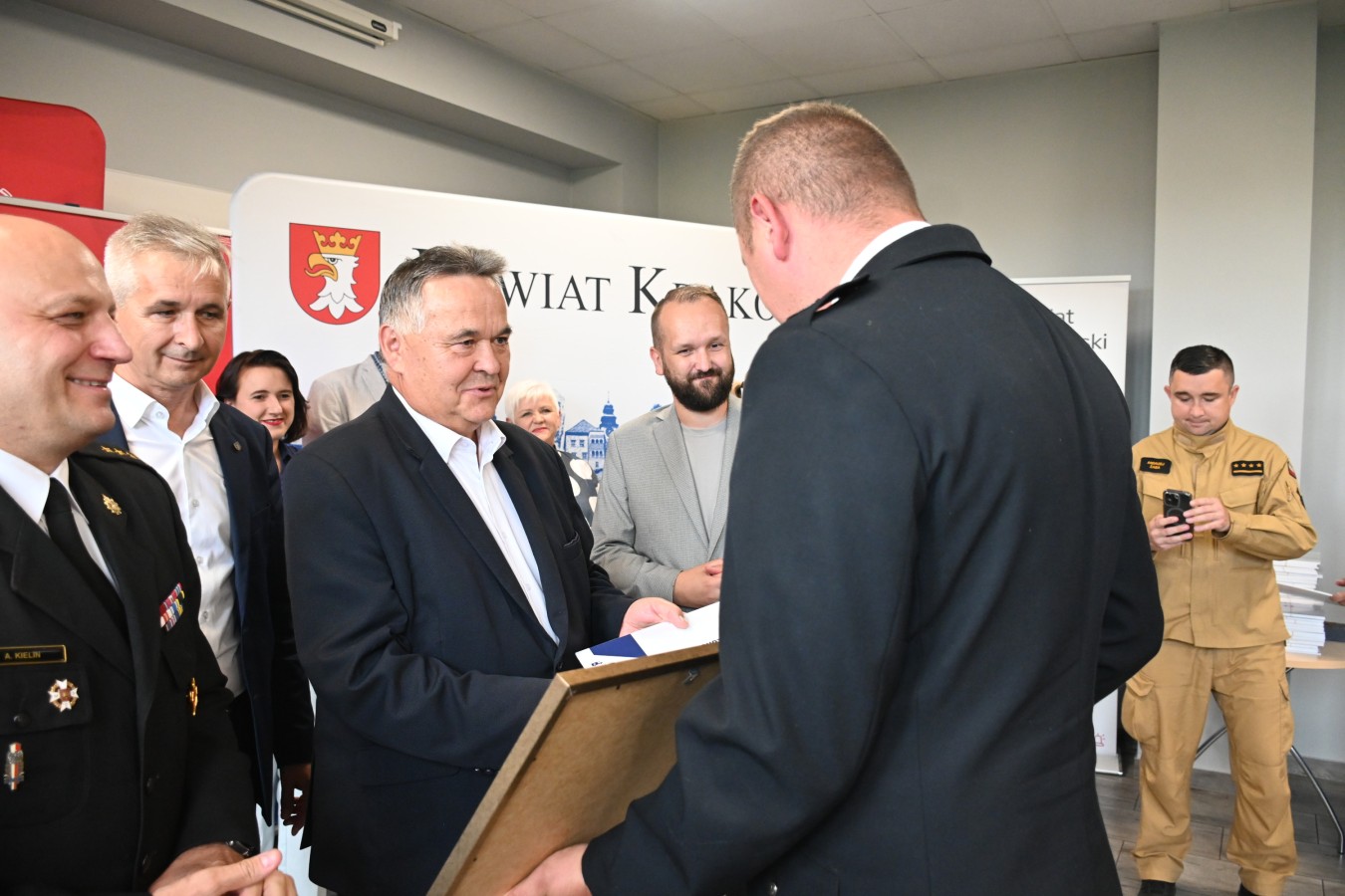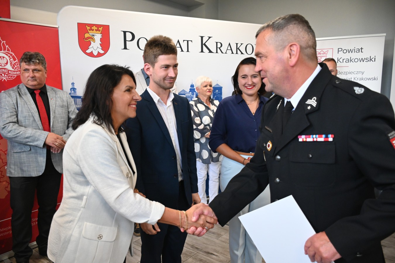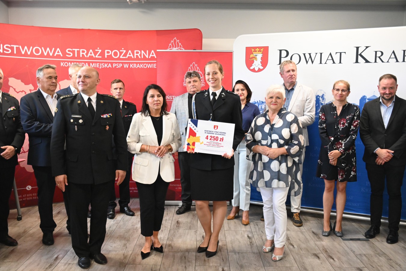 15 lipca 2025 r. na terenie Jednostki Ratowniczo-Gaśniczej Nr 5 w Krakowie odbyło się uroczyste wręczenie promes z dofinansowaniem do zakupu sprzętu i wyposażenia lub do zakupu samochodów i innych środków transportu w ramach działania „Wspieranie służb mundurowych” z programu „Bezpieczny Powiat Krakowski”